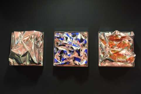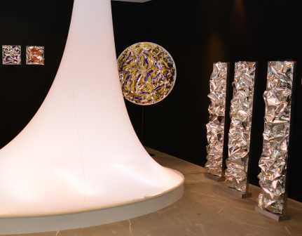 The scultures 100% Recyclable, are unique and exclusive, realized with ALUFLEXIAŽ,exclusive aluminum flexible sheet designed by Tiziana Lorenzelli with the support of a major european company. Research and development have led to an extremely malleable and versatile material, that keeps its shape when bended. Delicate aluminium surfaces, mirrored or decorated, are coupled with high technology machinery, that ensure exceptional plasticity. Sophisticated systems are needed to work the films without damaging the surface which is glossed so it won\\\\\\\\\\\\\\\'t oxidize. The exclusive characteristics of metallic ALUFLEXIAŽ, lightweight and malleable, create sculptural volumes generated by a flat surface; thanks to the intrinsic brightness of the material lights and reflections are creates. Similar to a solid, polished stainless steel volume, ALUFLEXIAŽ is very light and can be easily installed on walls and ceilings. The name itself 100% Recyclable suggests a provocative retooling of the artwork by assuming an end of cycle like most human artifacts. Lorenzelli has already worked on the re-use and recycle themes realizing sculptures with scraps from metallic and computer industries that have been published and exposed in Los Angeles in the early nineties.